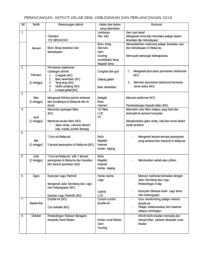 Aktiviti tahunan kelab kebudayaan sekolah rendah : aktiviti kelab kebudayaan. Cadangan aktiviti kelab kesenian kebudayaan dan perlancongan 2016 pdf.